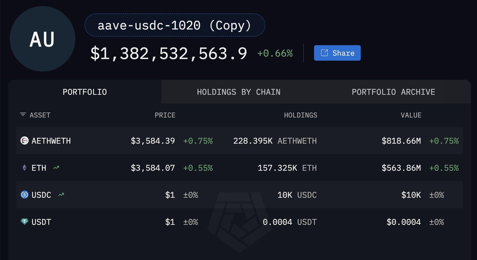 La entidad posee 228.39K ETH en posiciones prestadas por un valor de aproximadamente 818.6 millones de dólares y 157.32K ETH en tenencias directas al contado por un valor de 563.8 millones, en el momento de la publicación el miércoles.