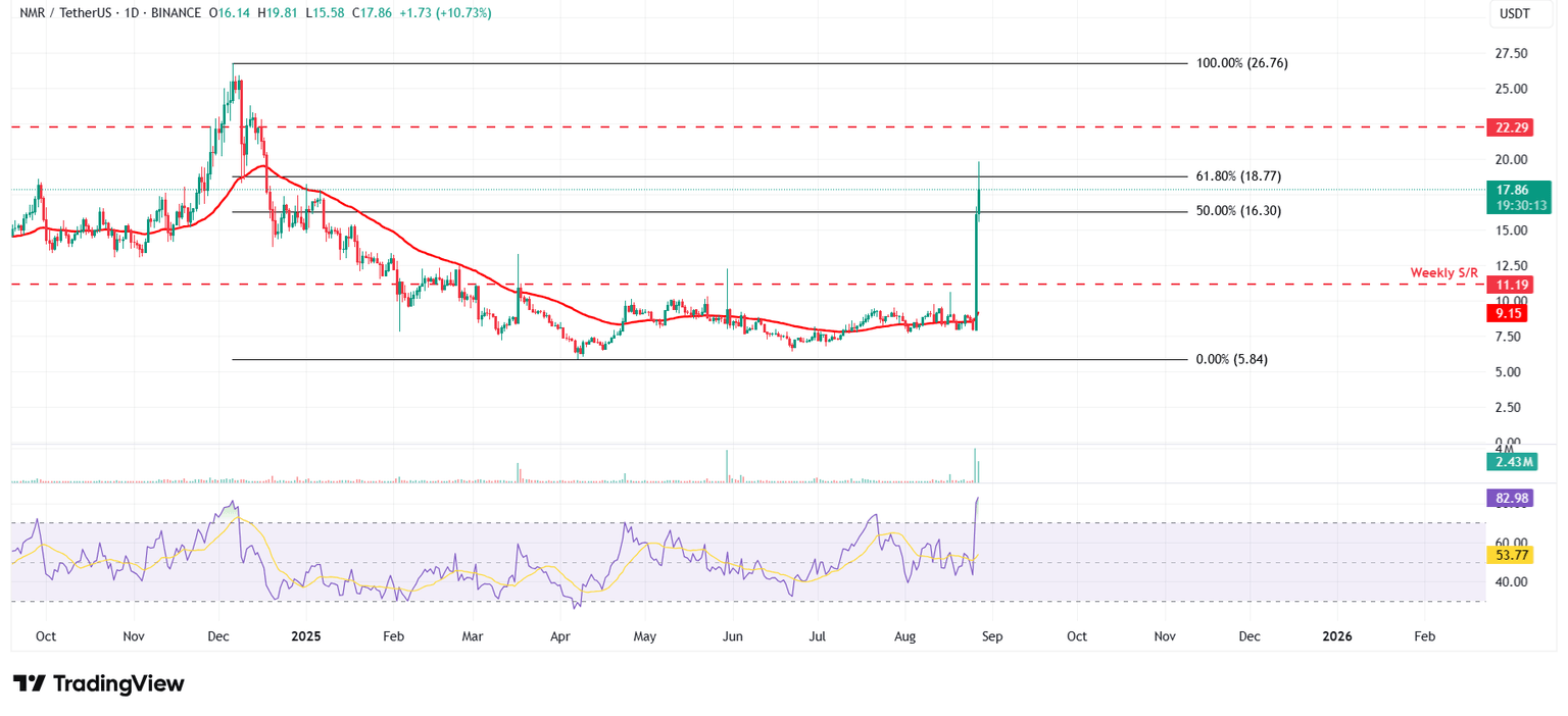 Bloomberg reportó el martes que el fondo cuantitativo crowdsourced Numerai ha asegurado un compromiso de hasta 500 millones $ de la división de gestión de activos de JPMorgan Chase & Co., que se desplegará durante el próximo año. La firma cuantitativa actualmente opera con aproximadamente 450 millones $. Esta noticia desencadenó un fuerte repunte en el precio del token NMR, con ganancias de más del 100% ese día.
