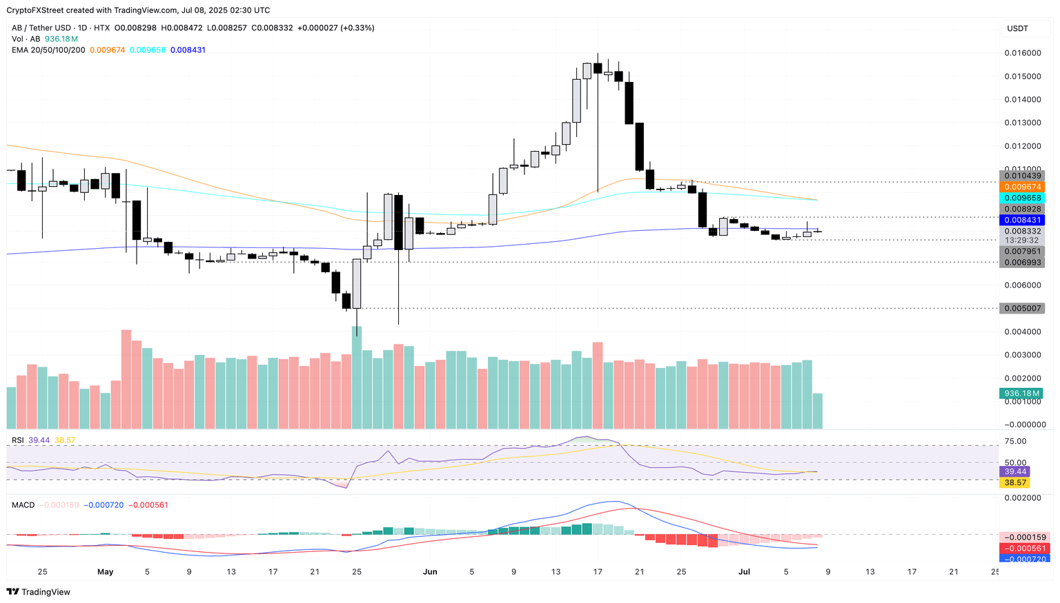 AB marca su cuarto día consecutivo de recuperación, rebotando desde el nivel de soporte local de 0.0079$. En el momento de escribir, AB avanza un 1% el martes, acercándose a la EMA de 200 días en 0.0084.