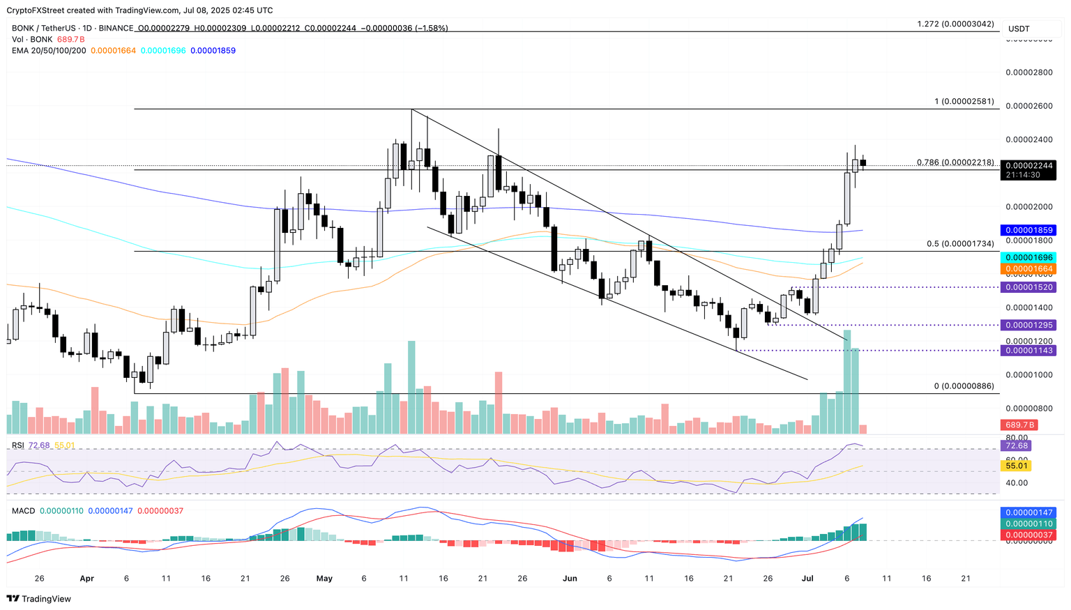 - Bonk rompe una resistencia crucial en medio de una tendencia alcista de seis días, mientras que el panorama técnico sugiere una nueva prueba.