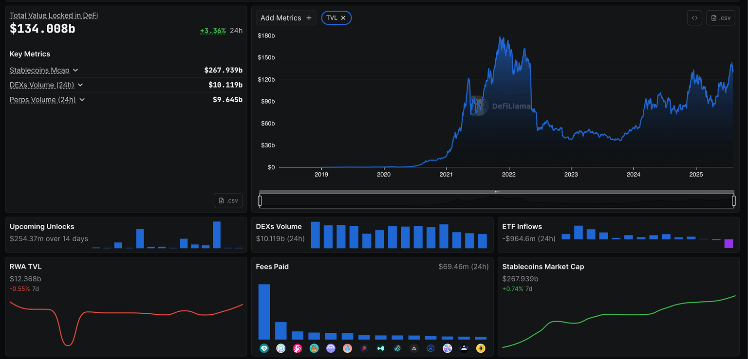 Más recientemente, el aumento de la actividad en la red de la blockchain de Ethereum y su creciente adopción institucional han catalizado el renacimiento de DeFi. A partir del 5 de agosto de 2025, los datos de DeFiLlama muestran que el TVL actual se sitúa en 134.000 millones de dólares, un cambio significativo desde menos de 40.000 millones de dólares en 2023.