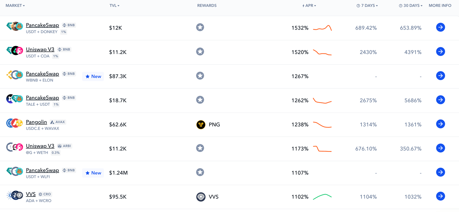 Según De.Fi, los múltiples fondos de liquidez en Uniswap y PancakeSwap ofrecen rendimientos anuales de entre 1.200% y 1.500%.