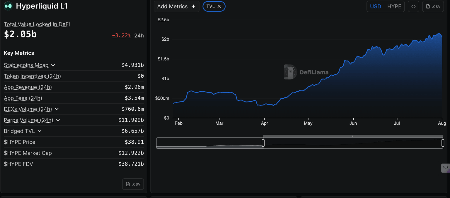 - El TVL de HYPE DeFi disminuye ligeramente pero se mantiene por encima de la marca de 2.000 millones de dólares.