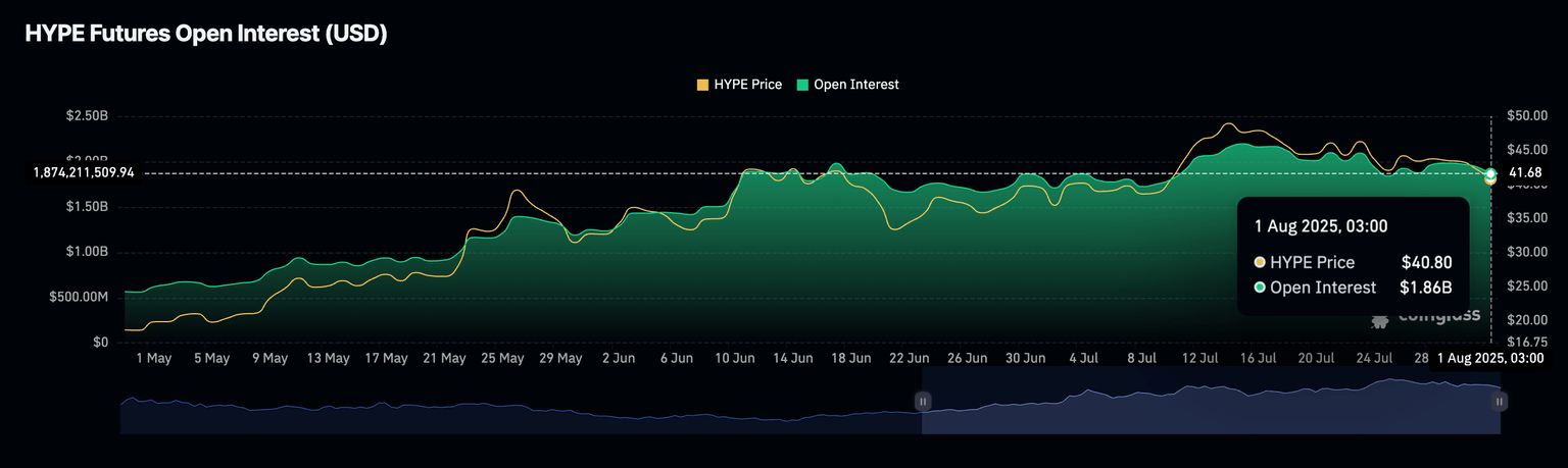 La reversión en el TVL coincide con una ligera caída en el Interés Abierto de futuros (OI), promediando 1.86 mil millones de dólares después de alcanzar un pico de 2.19 mil millones de dólares el 15 de julio. Si esta caída persiste, indicaría una falta de convicción en la capacidad de HYPE para mantener la recuperación, ya que menos operadores apalancan posiciones largas.