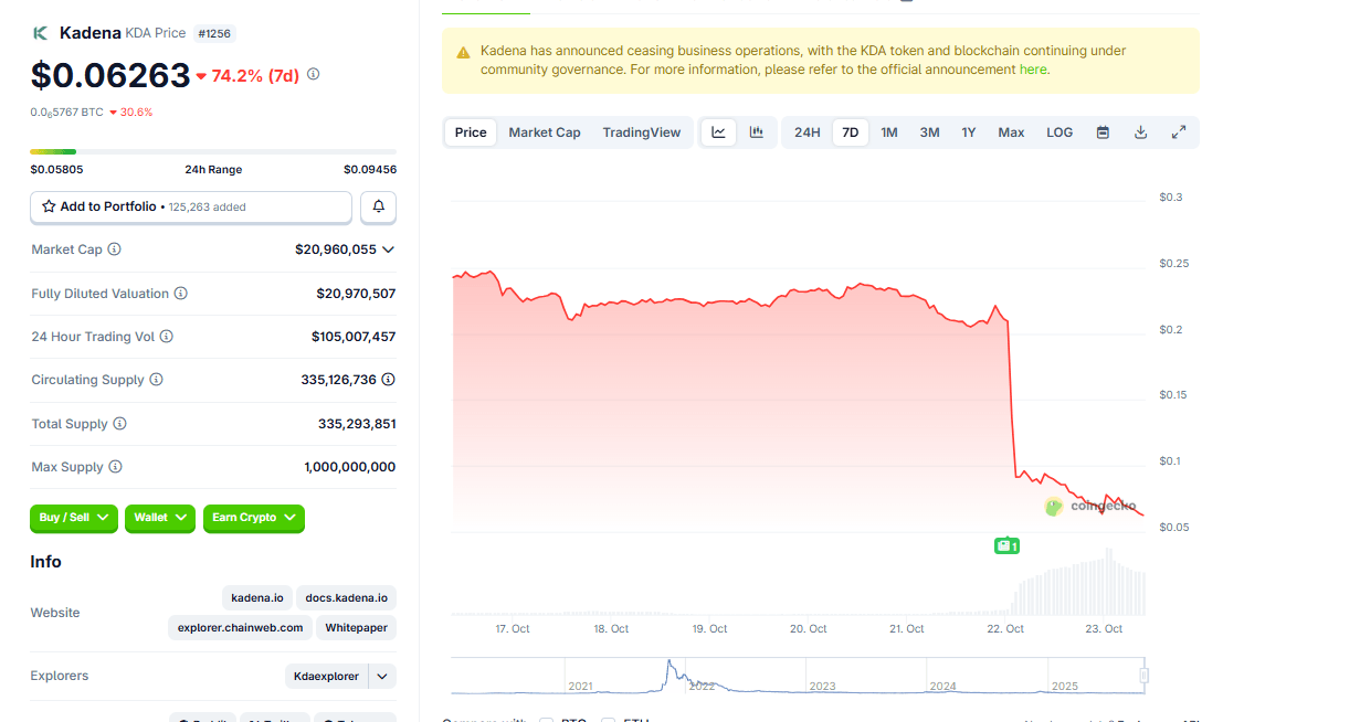 - El precio de Kadena se negocia por debajo de 0,065$ el jueves después de caer más del 70% hasta ahora esta semana.