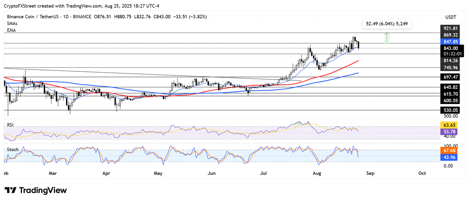 BNB cruzó por debajo de la media móvil exponencial (EMA) de 14 días y ahora busca encontrar soporte en 814$.