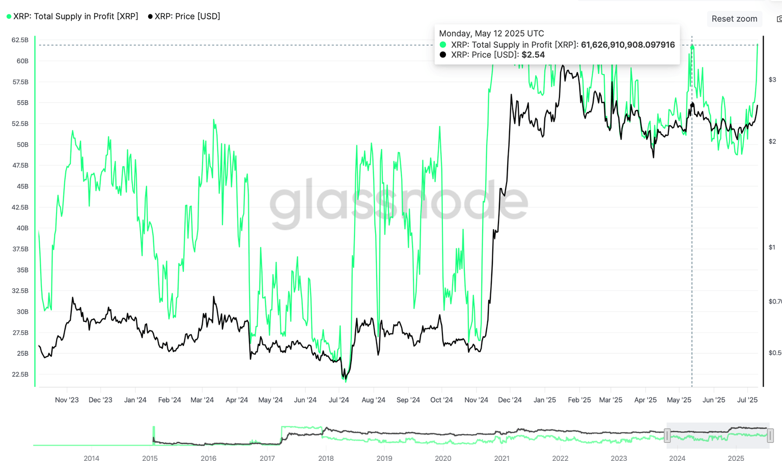 - La oferta en beneficio explota, acercándose al pico de mayo de alrededor de 62 mil millones de XRP, lo que señala una posible reversión de tendencia a corto plazo.