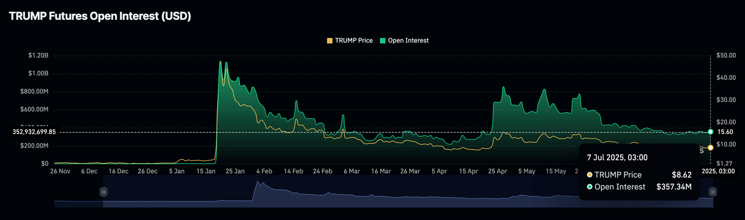 Los datos de CoinGlass indican que el interés abierto de los futuros de TRUMP promedia más de 357 millones de dólares el lunes. La línea verde en el gráfico a continuación indica un interés estable en el token, aunque a niveles significativamente más bajos en comparación con los observados en abril y mayo, con picos que superan los 800 millones de dólares.