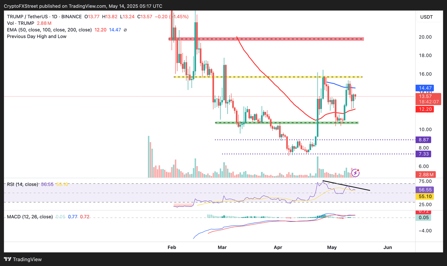 El token oficial Trump es técnicamente bajista, tras un rechazo del repunte de la semana pasada a 15.35$. Las caídas probablemente se intensificarán por debajo de la tasa de mercado actual de la moneda meme en 13.46$ basado en la divergencia negativa del Índice de Fuerza Relativa (RSI).