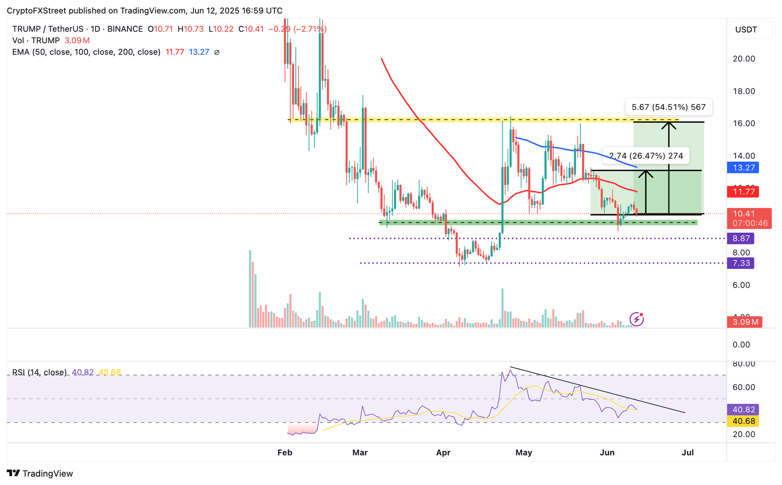 - La moneda meme TRUMP se mantiene cerca del nivel de soporte crítico de 10.00$ mientras la recuperación sigue siendo esquiva.