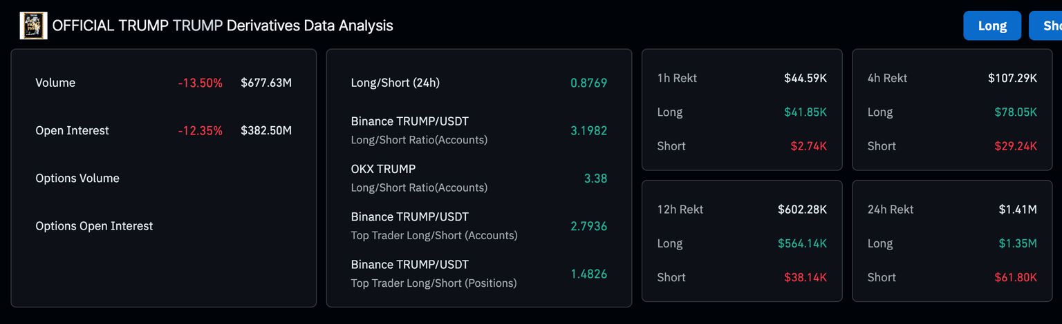 Mientras tanto, el interés en la moneda meme TRUMP ha estado disminuyendo, respaldado por una caída masiva en el volumen de comercio de casi un 14% a 678 millones de dólares en las últimas 24 horas. El interés abierto del mercado de derivados está en fuerte declive, bajando a 383 millones de dólares, marcando una caída del 12,4% en el mismo período.