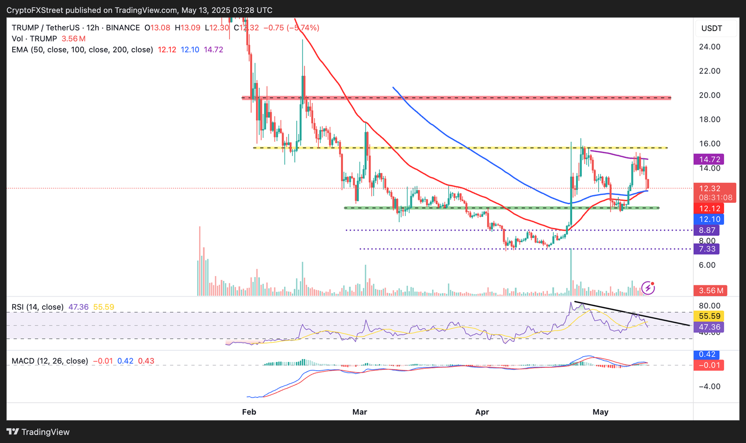 El precio de TRUMP actualmente se sitúa en 12.51$, mientras pone a prueba un soporte de confluencia alrededor de 12.11$, establecido por las EMAs de 50 y 100, como se ilustra en el gráfico diario.