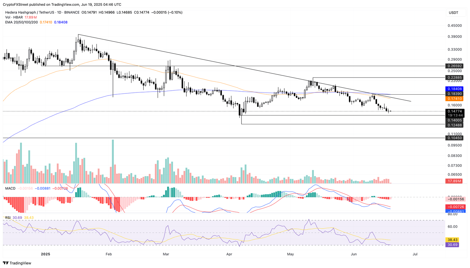 A medida que HBAR se acerca al nivel de soporte de 0.1400$, el precio de cierre más bajo del año hasta la fecha (YTD), una posible reversión podría tener como objetivo la media móvil exponencial (EMA) de 50 días en 0.1741$.