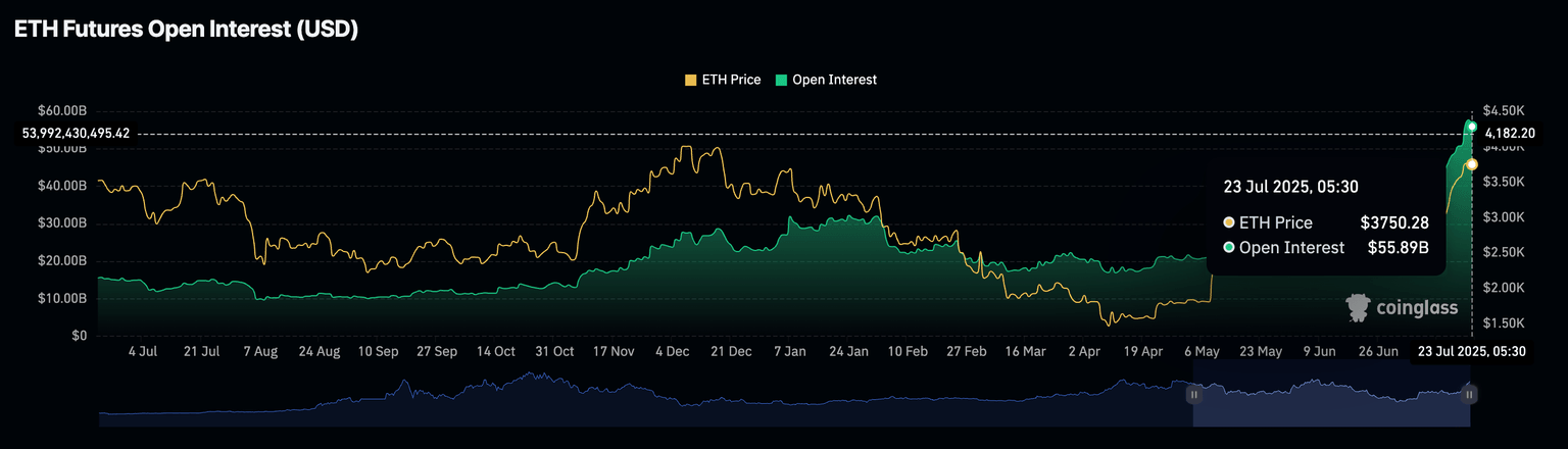 Además, los datos de Coinglass muestran que el Interés Abierto (OI) de ETH está en 55.89 mil millones de dólares, lo que está cerca del máximo histórico de 57.69 mil millones de dólares alcanzado el martes. El OI elevado en Ethereum se refiere a mayores entradas de capital en los derivados de ETH, una señal de mayor interés entre los traders.