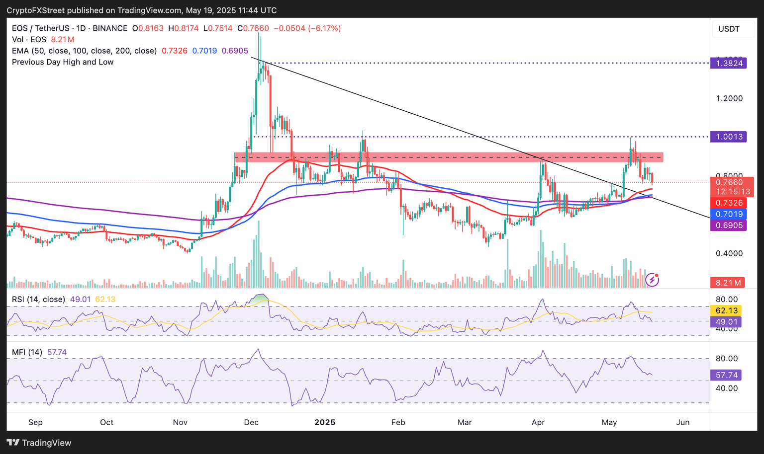 La corrección del precio de EOS desde el máximo del 10 de mayo, ligeramente por debajo de 1.00$, busca soporte por encima de la Media Móvil Exponencial (EMA) de 50 días en aproximadamente 0.73.