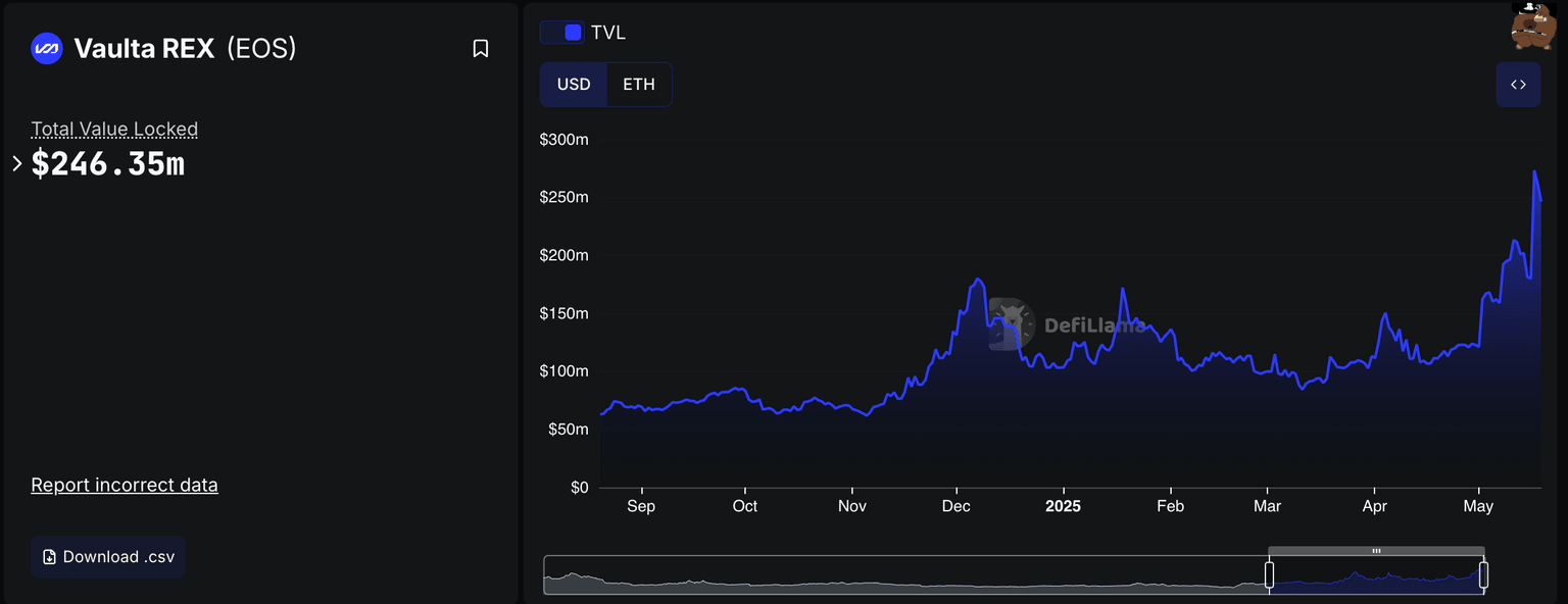 - El volumen de TVL DeFi de Vaulta, renombrado de EOS, alcanzó los 273 millones de dólares el sábado antes de corregirse a 246 millones de dólares.