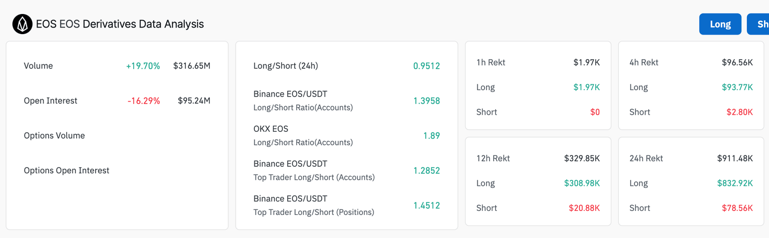 Los datos de derivados de CoinGlass muestran una caída significativa del 16% en el Interés Abierto (OI) a aproximadamente 95 millones de dólares, reflejando un interés decreciente de los traders. OI es el número total de contratos de futuros o opciones activos que no han sido cerrados o liquidados.