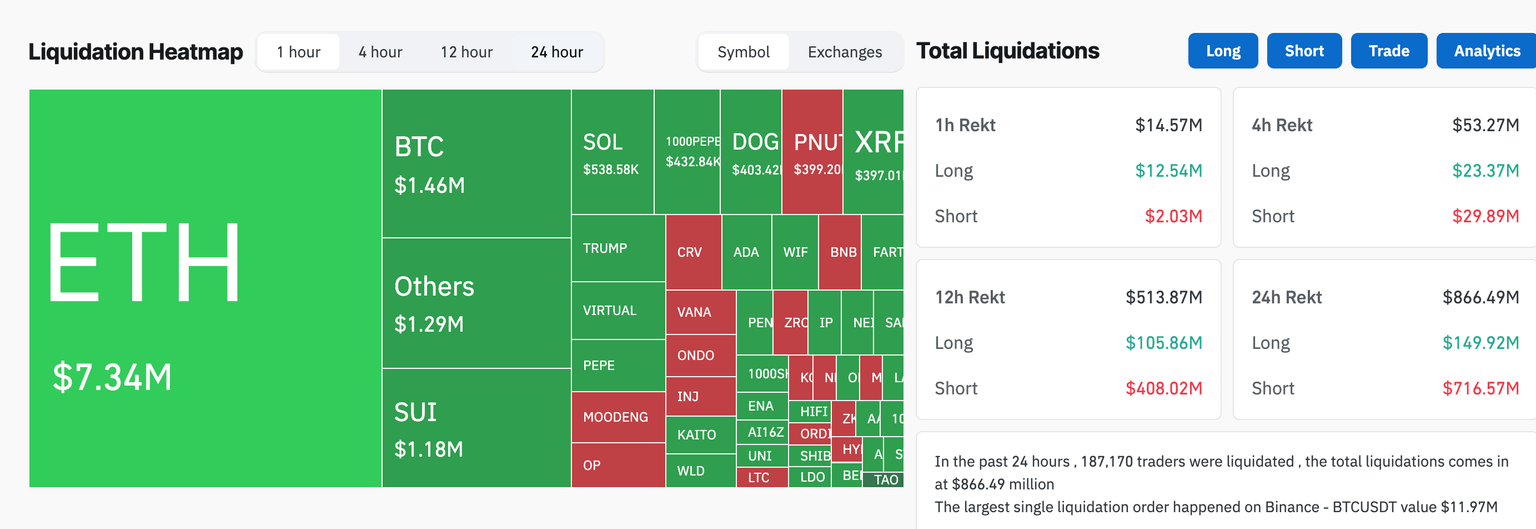 - Las liquidaciones aumentan en un mercado de criptomonedas alcista, alcanzando los 866 millones de dólares en 24 horas.