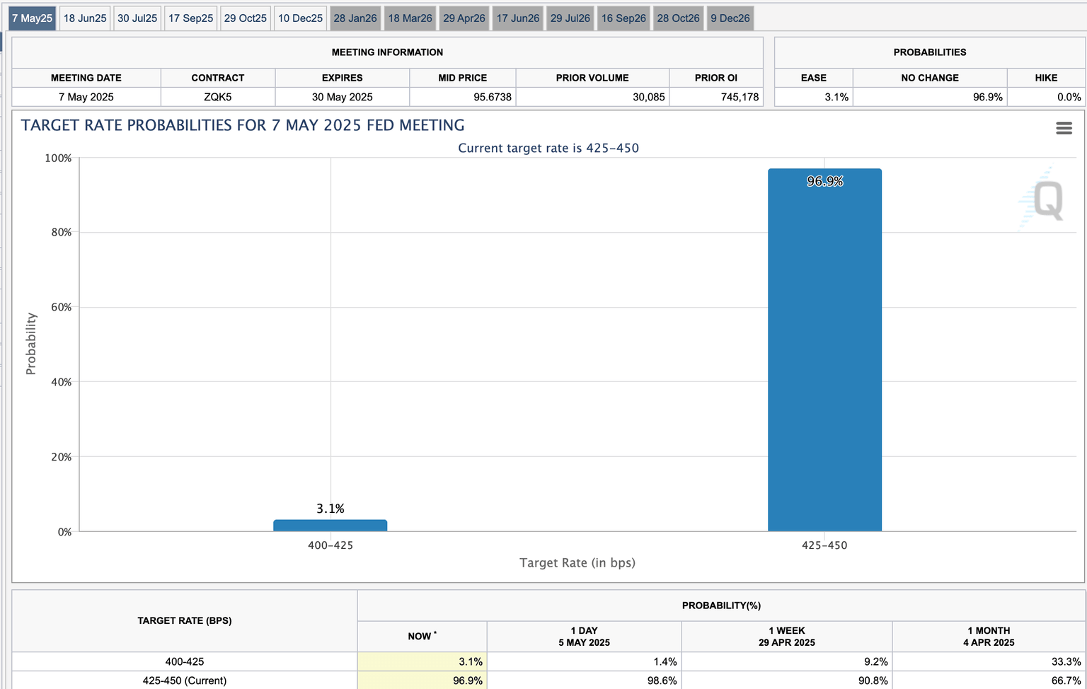 Se espera que la reunión del Comité Federal de Mercado Abierto (FOMC) el miércoles mantenga las tasas de interés sin cambios. La herramienta FedWatch del CME Group muestra una probabilidad del 96.9% de que las tasas de interés permanezcan sin cambios en el rango del 4.25%-4.50%.