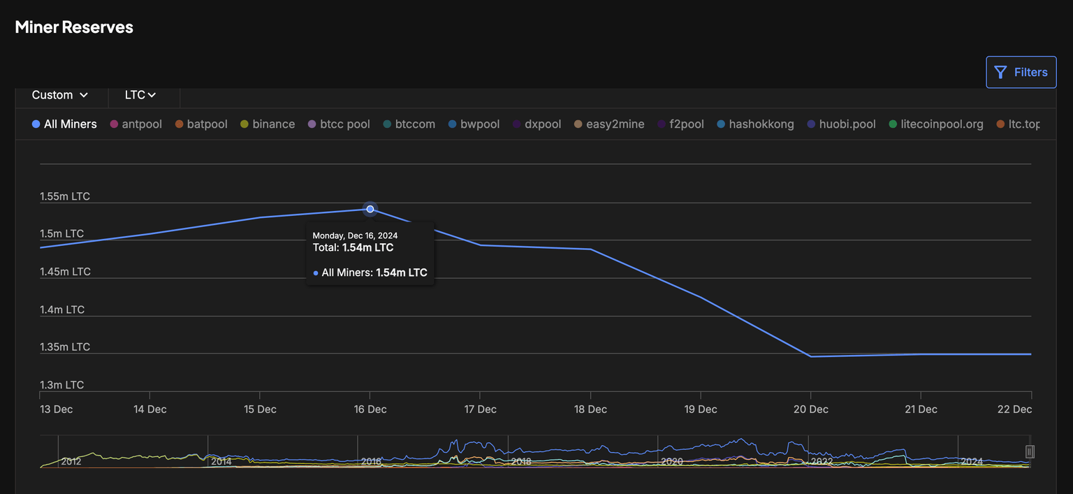 Entre el 16 y el 20 de diciembre, los mineros de Litecoin vendieron 210.000 LTC, reduciendo sus saldos de reserva de 1,54 millones a 1,35 millones de LTC.