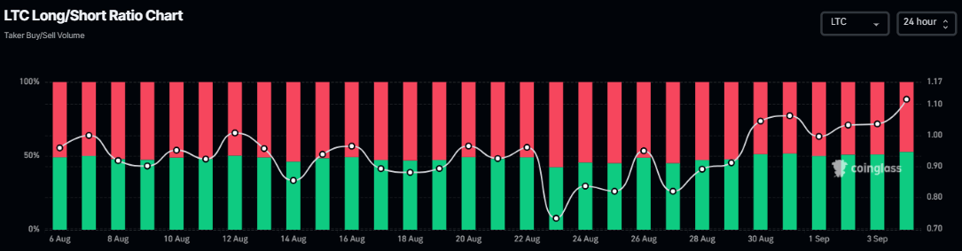 El ratio de largo a corto de Coinglass de LTC apoya aún más la perspectiva alcista. El ratio se sitúa actualmente en 1.11, el nivel más alto en más de un mes, lo que indica que los traders están apostando a que el precio del activo se recupere.