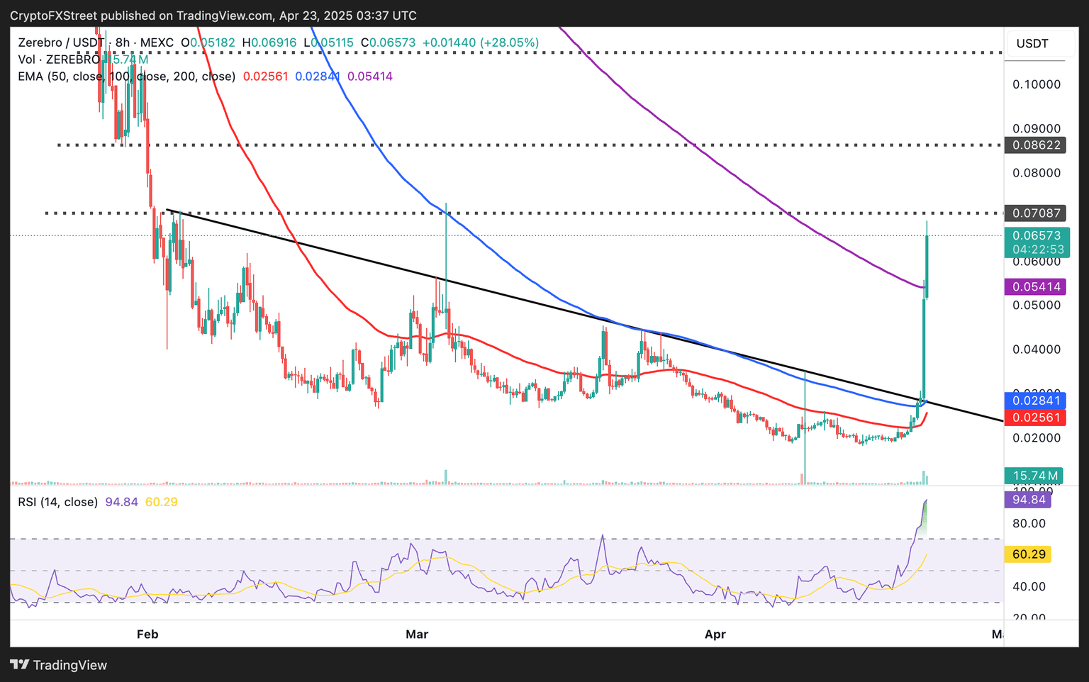 El precio de Zerebro se dispara más del 20% en el día para cotizar a 0.0669$ en el momento de escribir. La moneda meme basada en Solana se mantiene por encima de la EMA de 200 en el gráfico de 8 horas, consolidando la presencia de los alcistas en el mercado.
