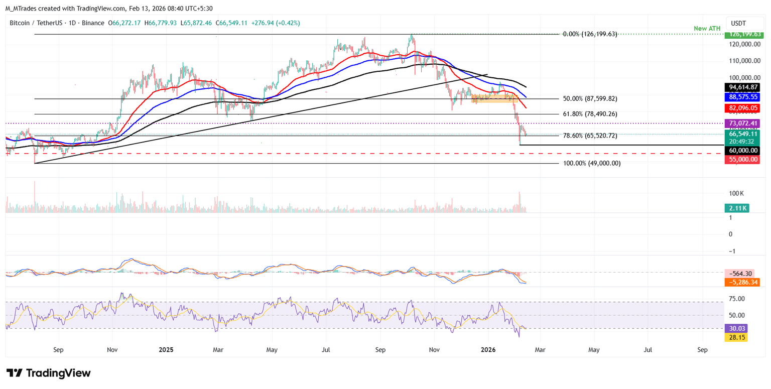 Si BTC rompe y cierra el retroceso de Fibonacci del 78.6% (dibujado desde el mínimo de agosto de 2024 de 49.000$ hasta el máximo histórico de octubre de 2025 de 126.199$) en 65.520$, podría extender el declive hacia el mínimo del 6 de febrero en 60.000$.