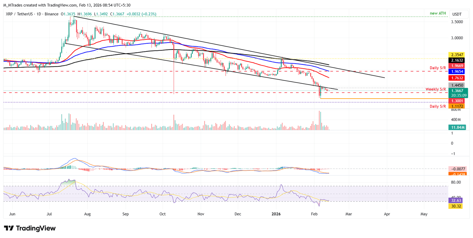 XRP revisitó el límite de la línea de tendencia rota de un cuña descendente el 6 de febrero y ha estado enfrentando rechazo alrededor de ese nivel, cayendo un 7% hasta el jueves. Al momento del viernes, XRP cotiza por debajo de 1.36$.