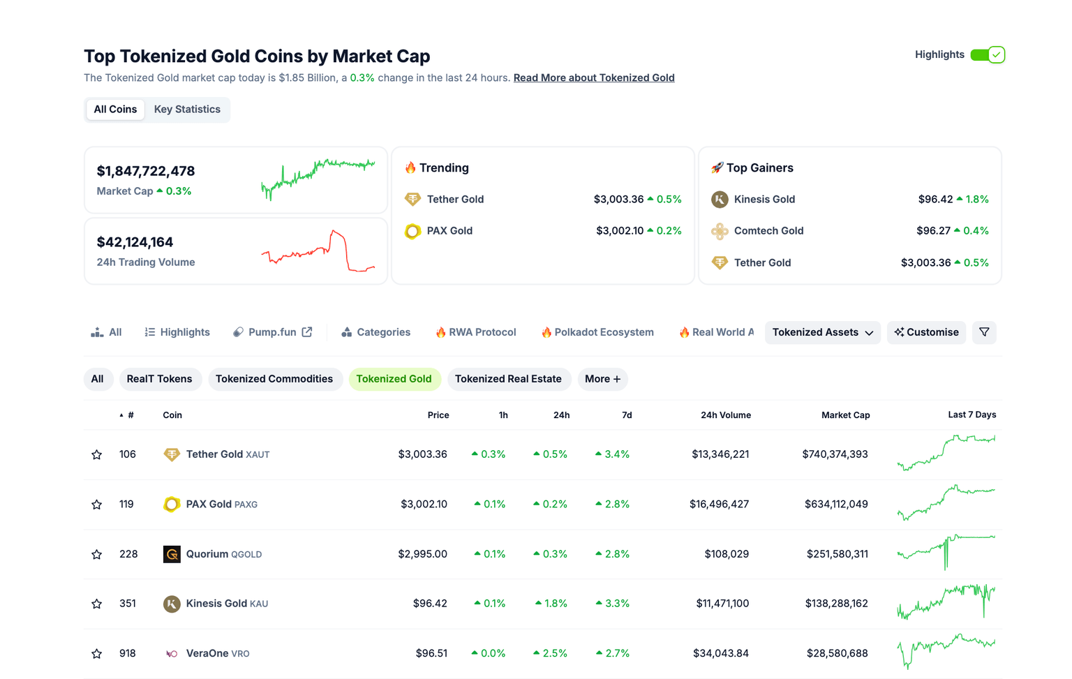 Según datos de Coingecko, el sector de tokenización agregado alcanzó los 1.8 mil millones de dólares a medida que los precios del Oro cruzaron la zona de 3.000 dólares el lunes.