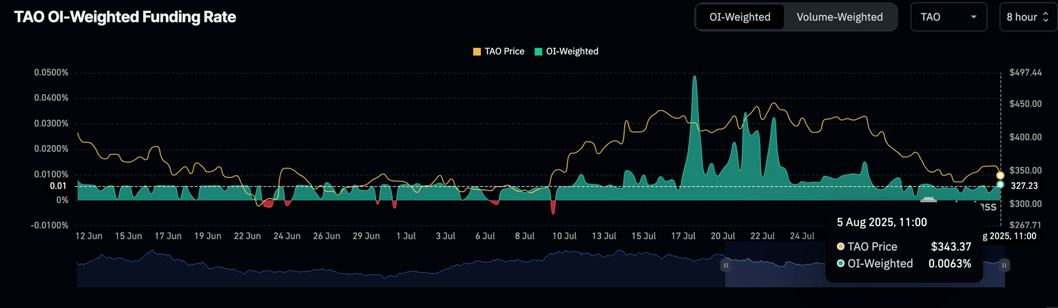 Las áreas clave de interés para los operadores son niveles de soporte tentativos en 328$ y 300$. La tendencia a la baja en TAO podría persistir en medio de una caída significativa en la tasa de financiación ponderada de futuros desde un pico de julio de 0.0489% hasta 0.0063% en el momento de escribir este artículo.