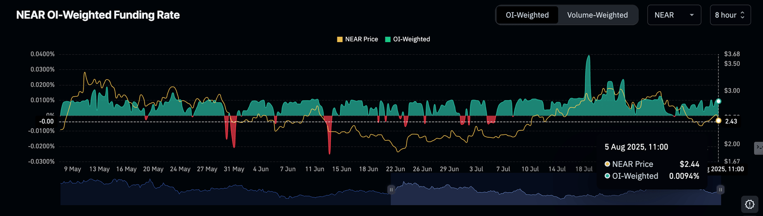 - La tasa de financiación de futuros de NEAR se mantiene cerca de la línea media, indicando que menos operadores están apalancando posiciones largas.