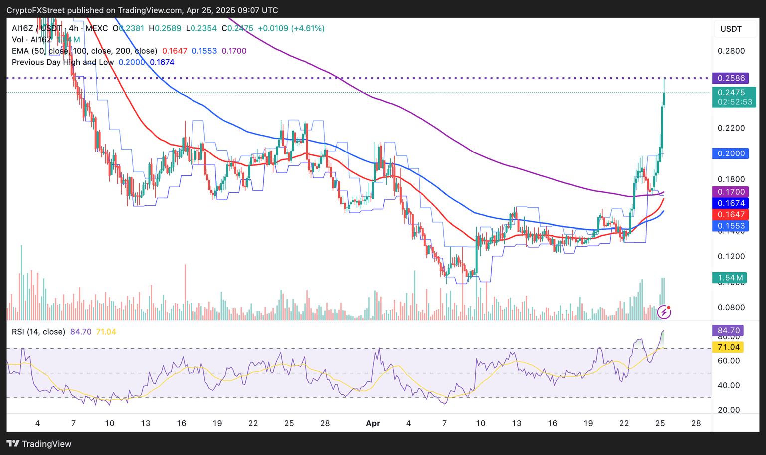 El precio de AI16Z se sitúa cerca de 0.25 $ al momento de escribir, habiendo aumentado casi un 30% en el día. El creciente sentimiento en torno a los tokens enfocados en IA podría estar alimentando la fuerte perspectiva alcista, que alcanzó máximos semanales de 0.2586 $ por primera vez desde principios de marzo.