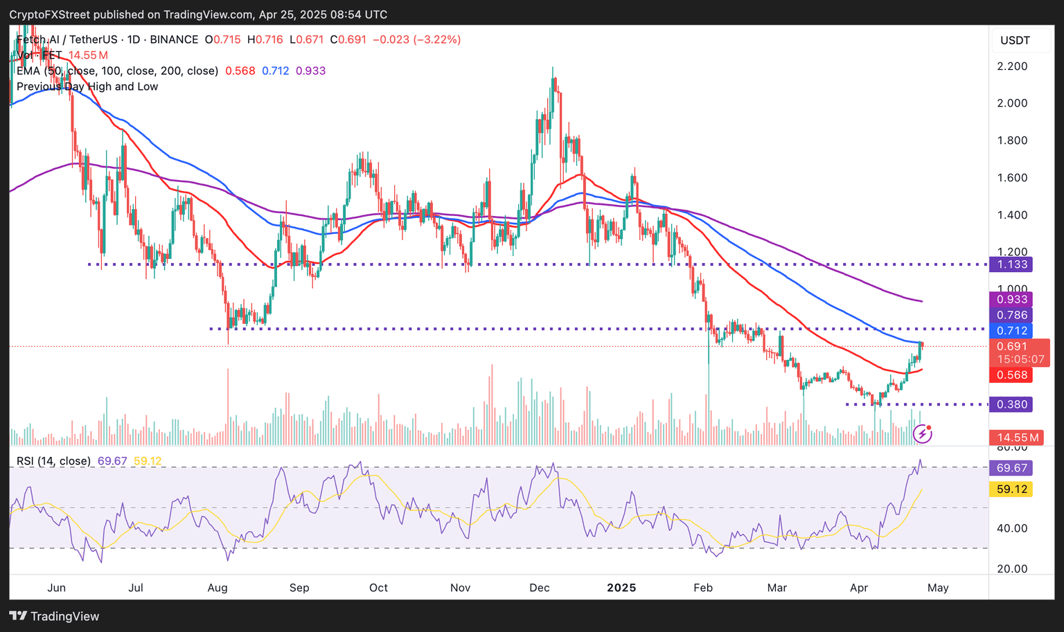 El precio de FET ha subido casi un 100% desde su cierre diario más bajo de este mes de 0.38 $, registrado el 8 de abril. La ola alcista de las últimas semanas elevó el token de IA a 0.71 $, un nivel marcado por la EMA de 100 días. Sin embargo, debido a una caída en el volumen y la disminución de la convicción entre los traders, FET ha retrocedido y actualmente se cotiza a 0.69 $ al momento de escribir.