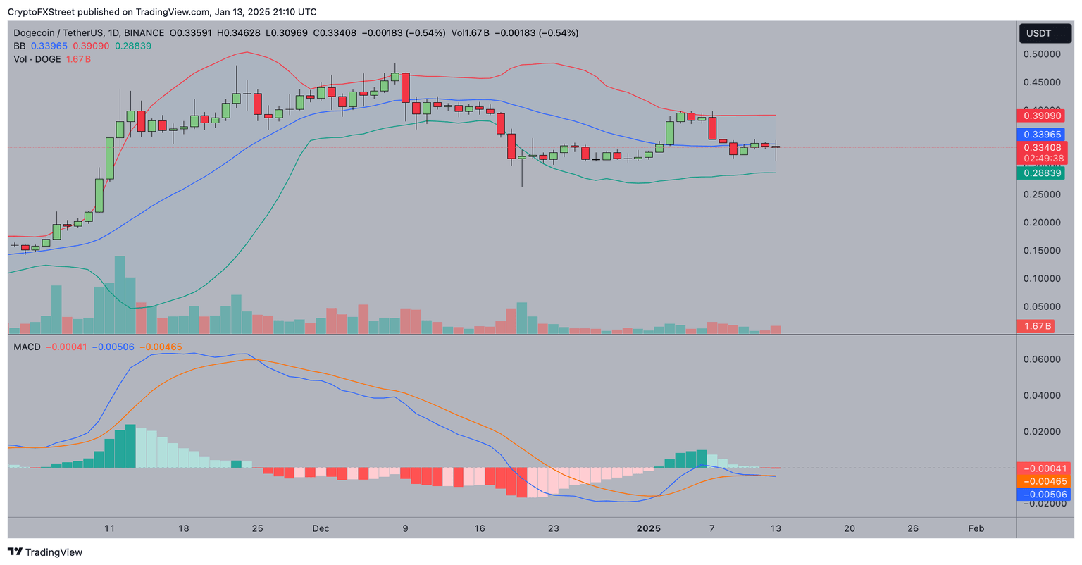 El gráfico diario de Dogecoin refleja indecisión, con el precio cerrando en 0.3334$ cerca de la banda inferior de Bollinger en 0.2883$.
