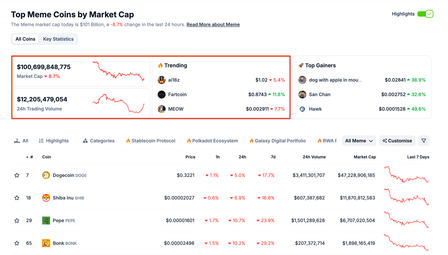 - El mercado global de monedas meme se contrajo un 8.7% el lunes, con la valoración total del sector cayendo hacia los 100.6 mil millones de dólares.