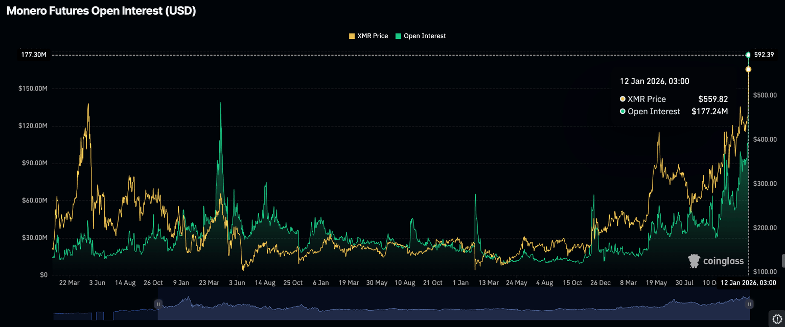 Monero continúa superando a los principales activos de criptomonedas a medida que los operadores se centran en redes con potencial de retorno en medio de la creciente incertidumbre macroeconómica. Los datos de CoinGlass muestran que el mercado de derivados de XMR está en su nivel más fuerte de la historia, con el interés abierto de futuros (OI) alcanzando un récord de 177 millones de dólares el lunes, desde aproximadamente 116 millones de dólares el domingo.