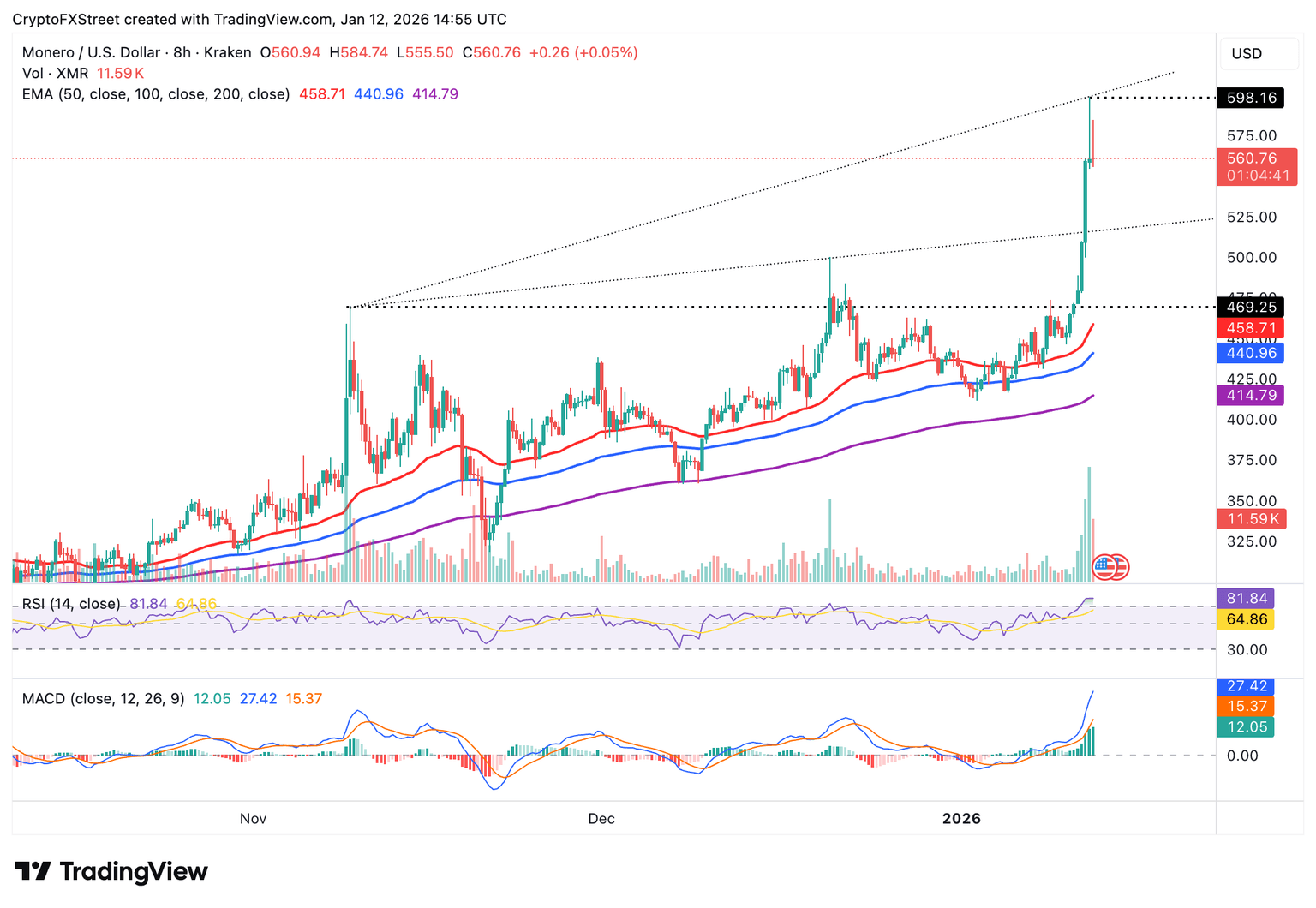 Monero se cotiza a 560$ en el momento de escribir este artículo el lunes. El token se mantiene por encima de la media móvil exponencial (EMA) de 200 días en 415$, la EMA de 100 días en 441$ y la EMA de 50 días en 458$, todas las cuales apoyan una perspectiva alcista a corto plazo.
