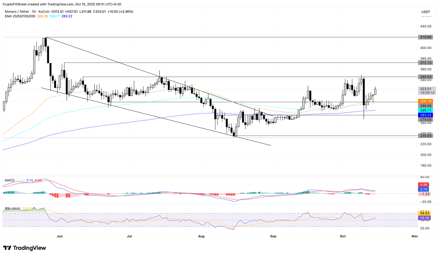 Monero extiende la tendencia alcista por quinto día consecutivo, rebotando en la media móvil exponencial (EMA) de 100 días en 295$. En el momento de la redacción, XMR cotiza por encima de 320$ mientras el rebote busca superar la pérdida del 14% desde el viernes.