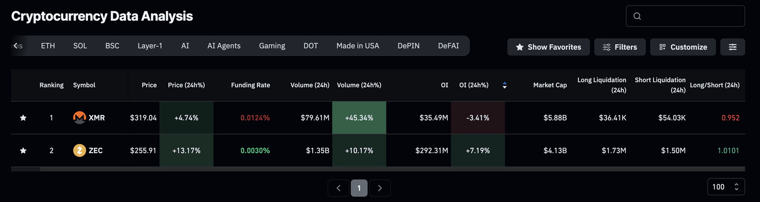 Interés abierto de monedas de privacidad. Fuente: CoinGlass