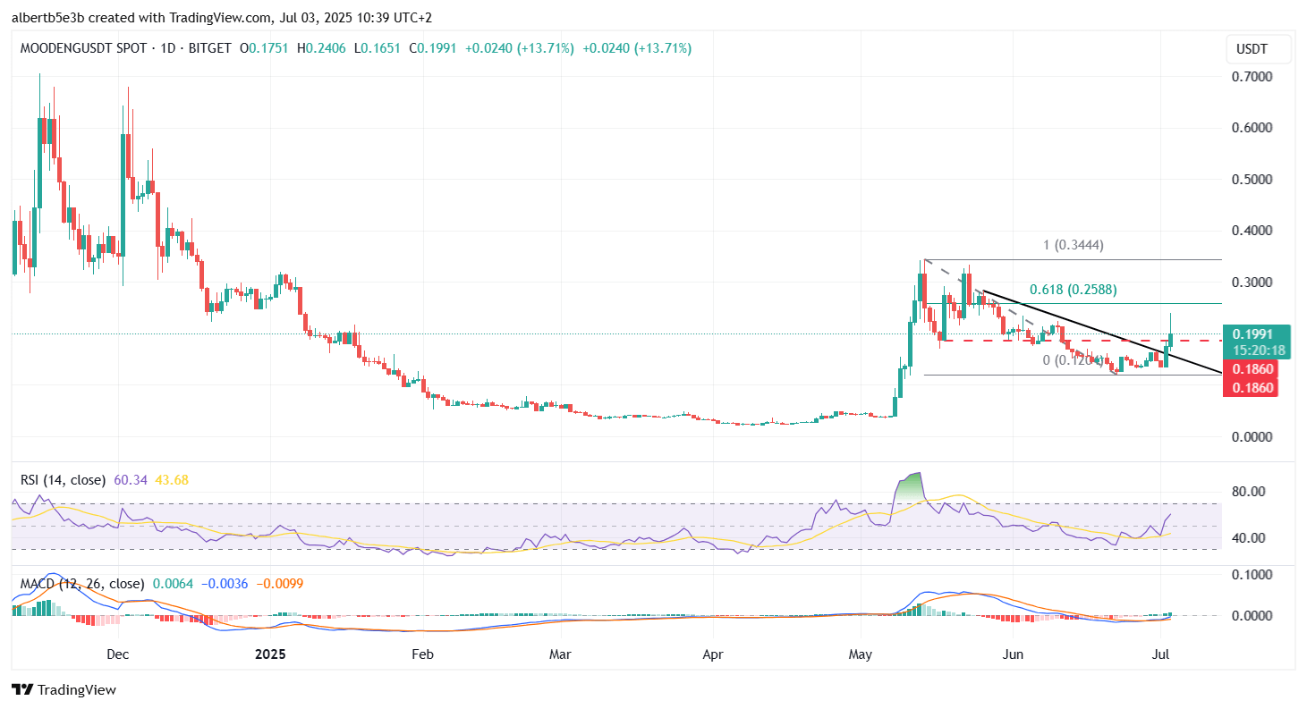 El gráfico diario de MOODENG muestra que rompió por encima de la línea de tendencia descendente (trazada contando múltiples máximos desde el 26 de mayo) el miércoles, subiendo un 28% ese día. En el momento de escribir el jueves, está rompiendo por encima de su nivel de resistencia diario de 0.186$.