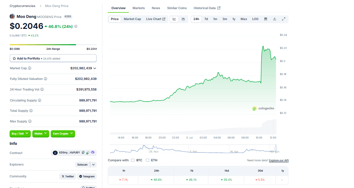 - La capitalización de mercado de MOODENG alcanza los 217 millones de dólares, superando a monedas meme como Neiro y Baby Doge Coin.