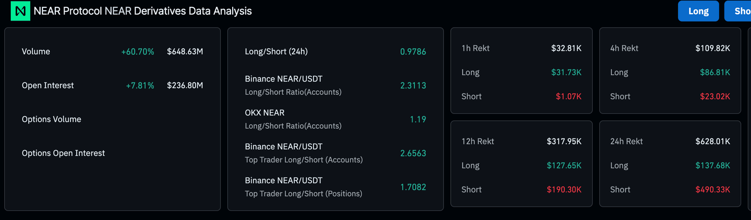 Un aumento del 7% en el Interés Abierto del mercado de derivados a alrededor de 237 millones de dólares, junto con un aumento en el volumen del 61% a aproximadamente 649 millones de dólares, sugiere que el interés en NEAR está creciendo. Las liquidaciones en las últimas 24 horas totalizaron 628.000$, con aproximadamente 490.000$ en posiciones cortas y alrededor de 137.000$ en posiciones largas.