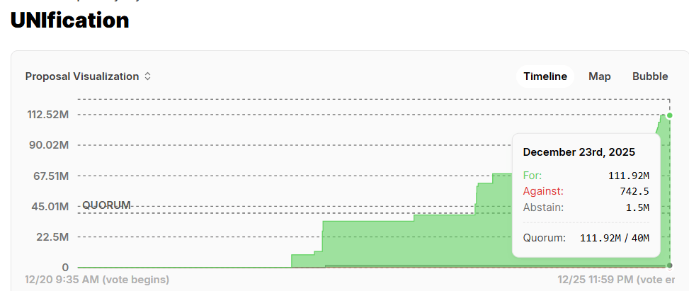 Hasta el martes, la propuesta ya ha superado el umbral de quórum, como se muestra en el gráfico a continuación, con más de 111 millones de tokens UNI votando a favor frente a solo 742 en contra, lo que indica un fuerte apoyo de la comunidad. Aunque la votación permanece abierta hasta Navidad, el amplio margen sugiere que el resultado está efectivamente decidido.