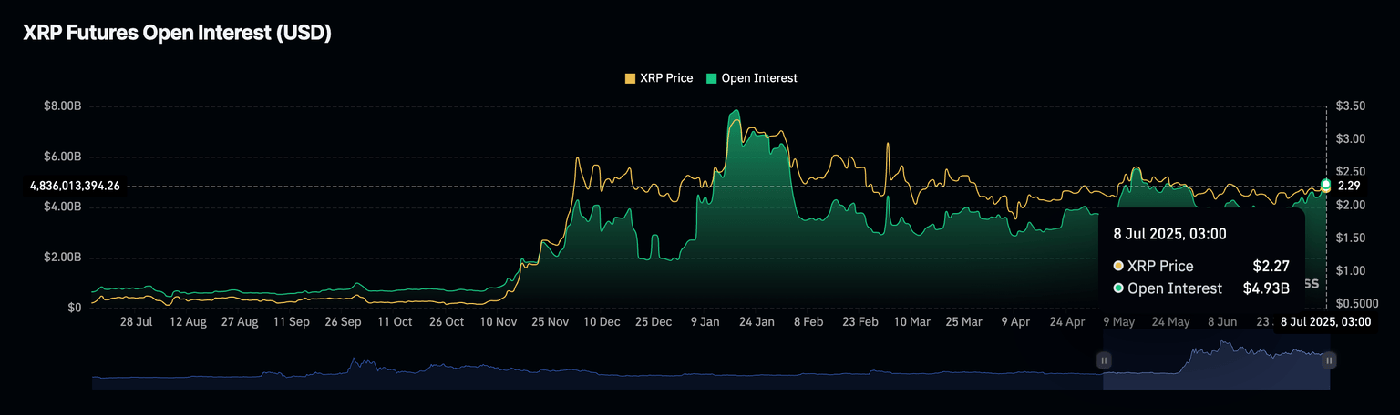 El interés en XRP se mantiene constante, aunque aumentando gradualmente, como lo refleja el Interés Abierto (OI) del mercado de futuros. Según datos de CoinGlass, el OI, que representa el valor de todos los contratos de futuros y opciones que no han sido liquidados o cerrados, ha aumentado a 4.930 millones de dólares después de caer a 3.530 millones de dólares el 23 de junio.