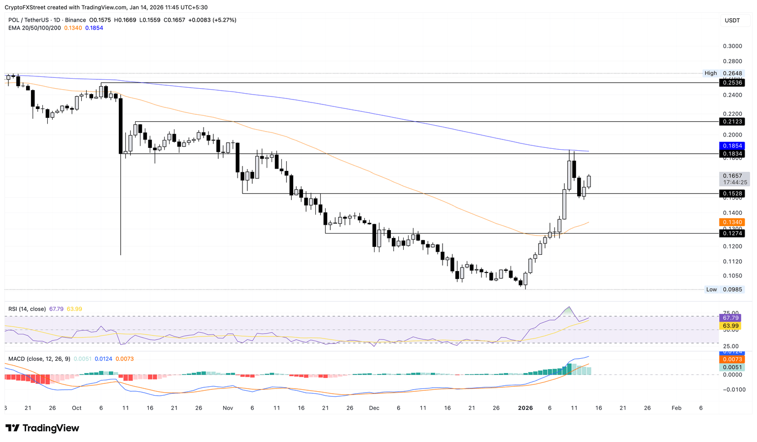 Polygon se mantiene estable por encima de 0.1600$ el miércoles, manteniendo las ganancias del 35% de la semana anterior. El ecosistema de sidechain de Ethereum ha recuperado más del 60% hasta ahora en enero, acercándose a una línea de tendencia de resistencia que conecta los máximos de diciembre de 2024 y septiembre de 2025 en el gráfico logarítmico semanal.