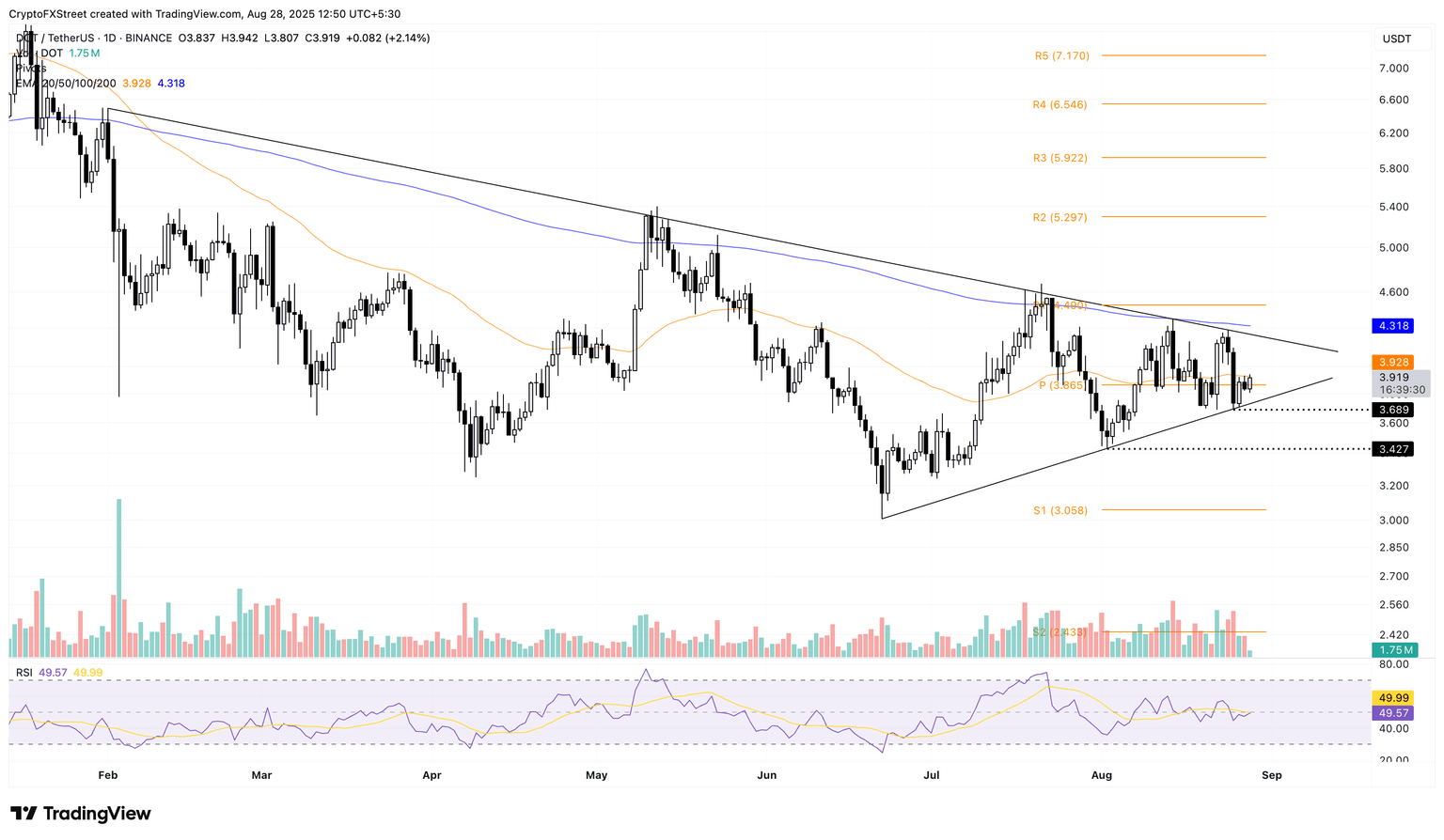 Mirando hacia abajo, si DOT cae por debajo de la línea de tendencia de soporte o del mínimo de 3.689$ del lunes, marcaría un resultado bajista del patrón de precios. Este caso podría hacer que Polkadot caiga al mínimo de 3.427$ del 2 de agosto.