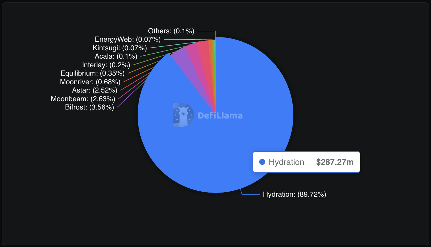 Los datos de DeFiLlama muestran que el TVL de Moonbeam es de 8.42 millones de dólares, con Hydration liderando entre las parachains, con un TVL de 287.27 millones de dólares, lo que representa una participación del 89.72%. Esto se traduce en un TVL de 320 millones de dólares para el ecosistema de parachains.