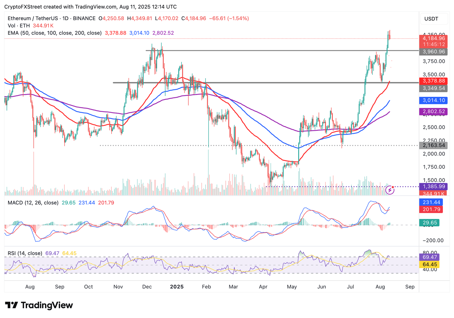 El precio de Ethereum está retrocediendo desde su máximo intradía de 4.349$ tras la tan esperada ruptura por encima de la resistencia de cuatro años en 4.000$. El mayor token de contratos inteligentes se está negociando a 4.184$ en el momento de escribir, reflejando una posible toma de beneficios y cambios en la dinámica del mercado de criptomonedas en general.