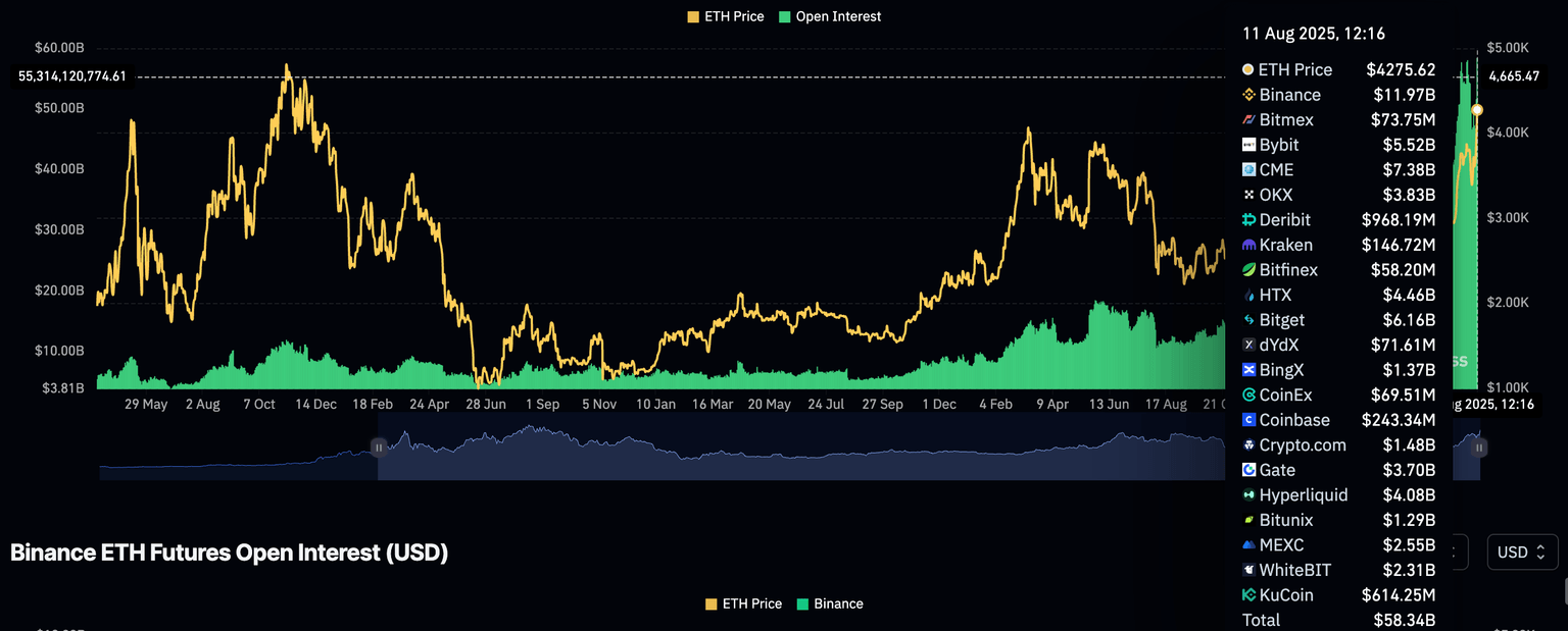 Aunque el sentimiento sigue siendo alcista, respaldado por el aumento del interés abierto de futuros (OI), los alcistas deben defender el soporte en 4.000$, especialmente si la toma de beneficios se convierte en el centro de atención en las próximas sesiones. Según datos de CoinGlass, el OI de futuros de Ethereum ha alcanzado un máximo de 58 millones de dólares, el nivel más alto registrado, lo que sugiere que el interés de los inversores en el token sigue elevado incluso cuando el precio se acerca al máximo histórico.