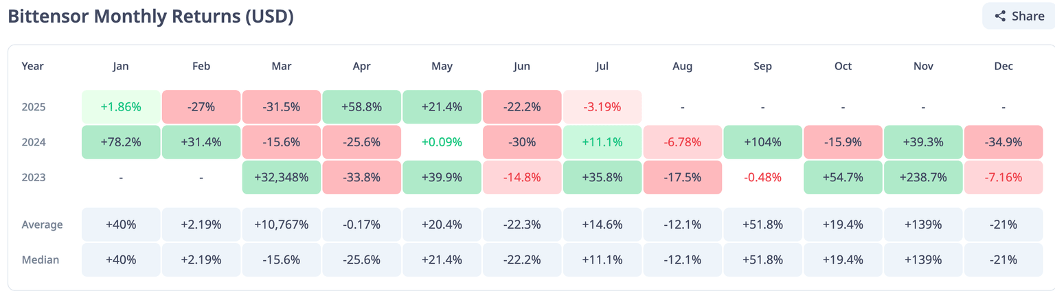 Rendimientos mensuales de Bittensor | Fuente: CryptoRank